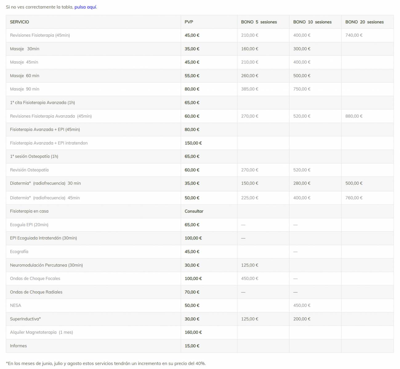 A continuación os dejamos los precios de nuestras terapias y tratamientos de fisioterapia en Marbella.